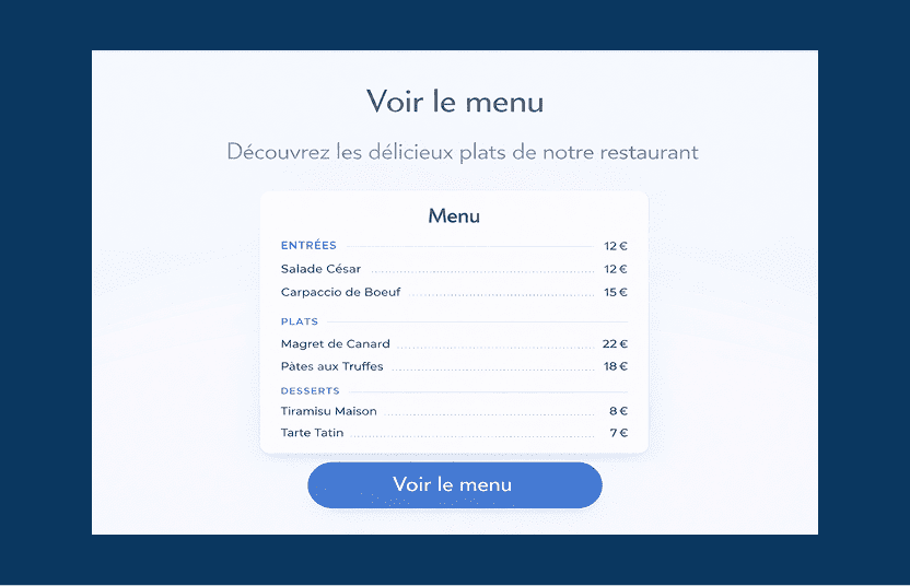 Nous créons un site fidèle à l’identité de votre restaurant, pensé pour être clair, structuré et efficace. Chaque élément est conçu pour mettre en valeur votre établissement et guider vos visiteurs.
